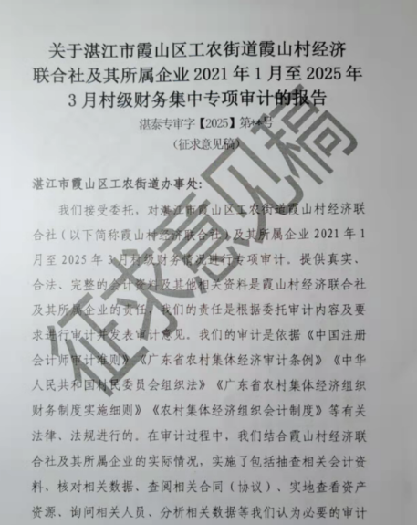 一份由湛江润泰会计师事务所出具的《村级财务集中专项审计报告》揭示了村内管理的严重问题:报告明确指出,霞山村经济联合社未建立基本的财务、固定资产及开支审批制度。南站服装批发市场B座、解放西路多处商铺等重大资产,竟未登记为村集体固定资产,存在巨大流失风险。超过1600万元的应收款项长期未清理。由黄建辉担任法定代表人的江霞物业服务有限公司,资产负债率高达296.27%,已资不抵债。2021年以来,其营业收入仅1338万元,利息支出却高达2574万元,完全依赖霞山村经济联合社持续“输血”5833万元用于还债。该公司所有物业收入未交回村集体,反而不断拖累集体经济。村民质疑该公司已成为转移集体利益的工具。然而,面对如此触目惊心的内容,该审计报告的最终意见竟为“尚未发现其他严重违法违纪的情况”。这一巨大反差令村民强烈质疑:如此审计是如何进行的?又是如何得以通过的?是监管不力,还是有意视而不见?