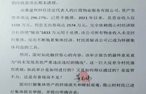 一份由湛江润泰会计师事务所出具的《村级财务集中专项审计报告》揭示了村内管理的严重问题:报告明确指出,霞山村经济联合社未建立基本的财务、固定资产及开支审批制度。南站服装批发市场B座、解放西路多处商铺等重大资产,竟未登记为村集体固定资产,存在巨大流失风险。超过1600万元的应收款项长期未清理。由黄建辉担任法定代表人的江霞物业服务有限公司,资产负债率高达296.27%,已资不抵债。2021年以来,其营业收入仅1338万元,利息支出却高达2574万元,完全依赖霞山村经济联合社持续“输血”5833万元用于还债。该公司所有物业收入未交回村集体,反而不断拖累集体经济。村民质疑该公司已成为转移集体利益的工具。然而,面对如此触目惊心的内容,该审计报告的最终意见竟为“尚未发现其他严重违法违纪的情况”。这一巨大反差令村民强烈质疑:如此审计是如何进行的?又是如何得以通过的?是监管不力,还是有意视而不见?