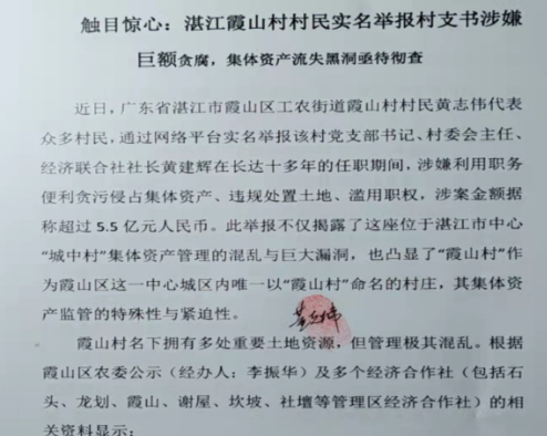 近日,广东省湛江市霞山区工农街道霞山村村民黄志伟代表众多村民,通过网络平台实名举报该村党支部书记、村委会主任、经济联合社社长黄建辉在长达十多年的任职期间,涉嫌利用职务便利贪污侵占集体资产、违规处置土地、滥用职权,涉案金额据称超过5.5亿元人民币。此举报不仅揭露了这座位于湛江市中心“城中村”集体资产管理的混乱与巨大漏洞,也凸显了“霞山村”作为霞山区这一中心城区内唯一以“霞山村”命名的村庄,其集体资产监管的特殊性与紧迫性。